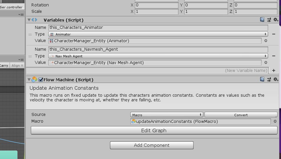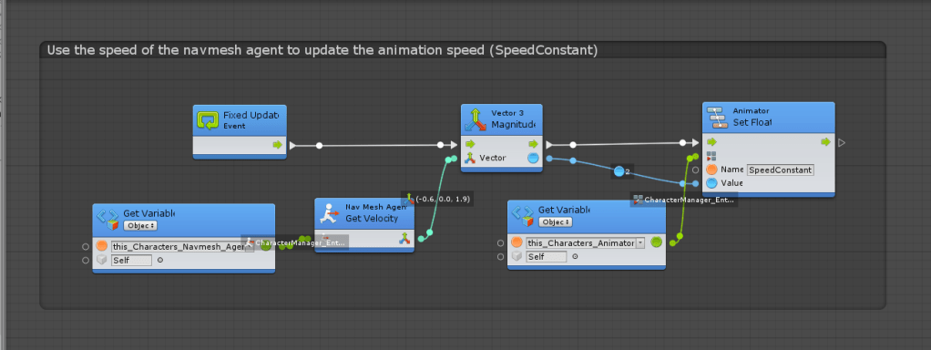 You will need two Flow Variables: this_Characters_Animator which will be an Animator object, and this_Characters_Navmesh_Agent which will be the Navmesh Agent you are using for your A.I. (Usually attached to the Root Transform of your character).