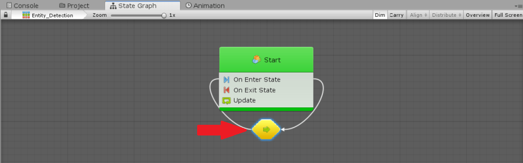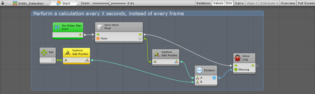 Delete the Update() and the OnExitState() Events. All we need is the OnEnterState(). It shouldn’t matter when we do this calculation, because the timer is the limiting factor. Throw your calculation in here; in my case I’m calculating the distance between two Entities in my game and outputting the result to the Debug Log.
